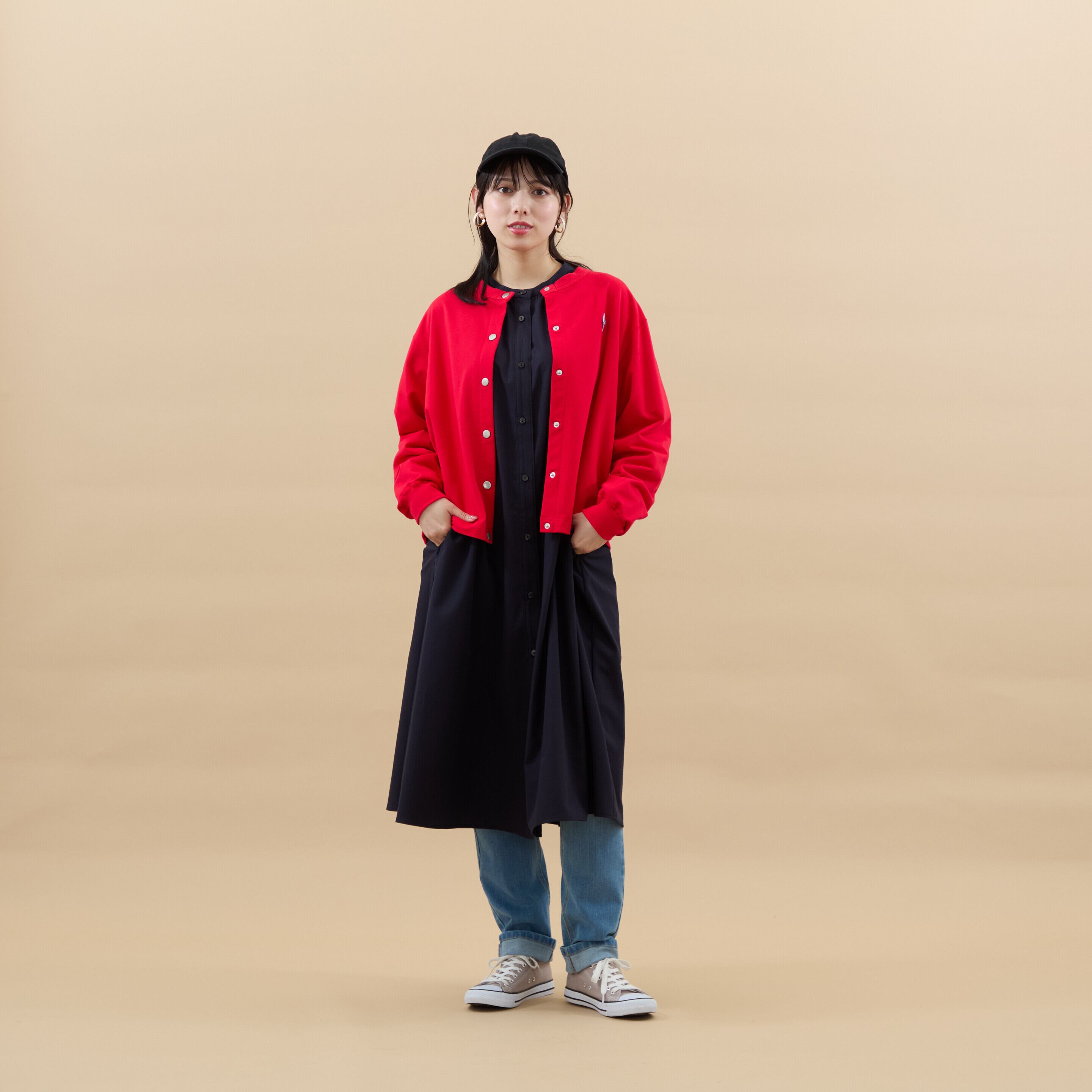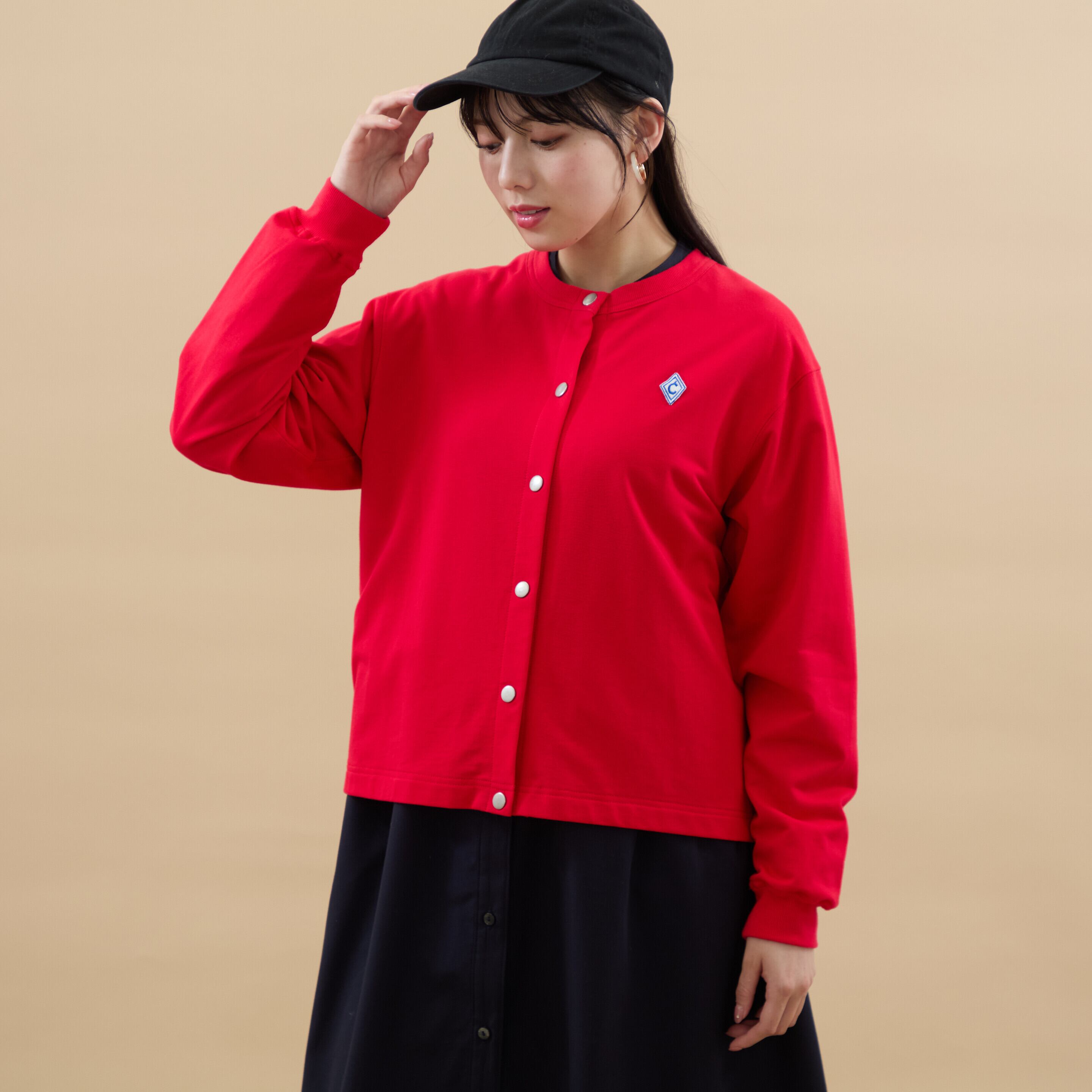 このカーデガンは、シンプルながら存在感のあるビビットな赤が特徴です。軽快なカットソー素材を使用しているため、着心地も抜群。ロングワンピースやチュニックと重ね着することで、一段とお洒落さを引き立てます。デニムとの組み合わせもおすすめで、カジュアルからキレイめまで多様なシーンに対応できます。