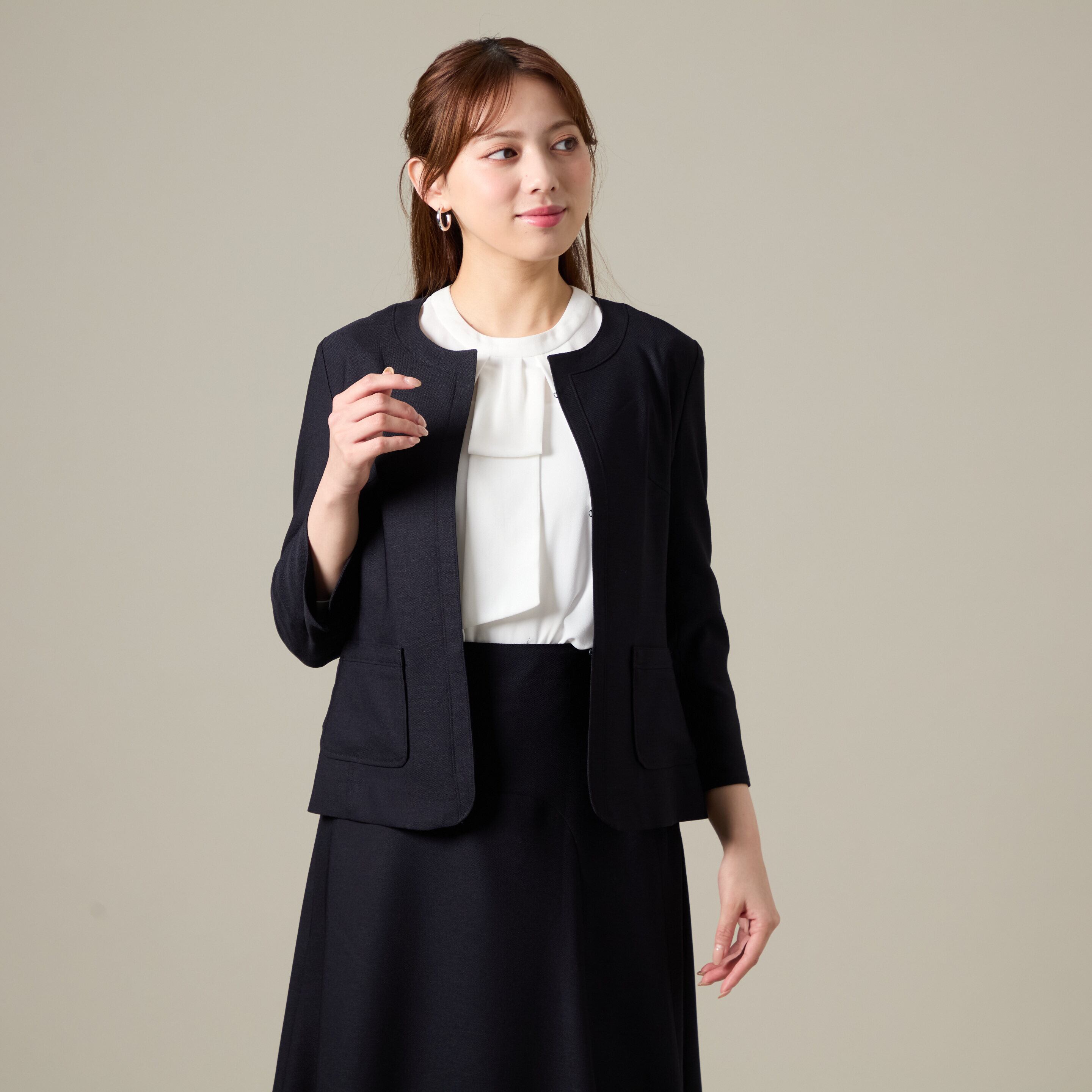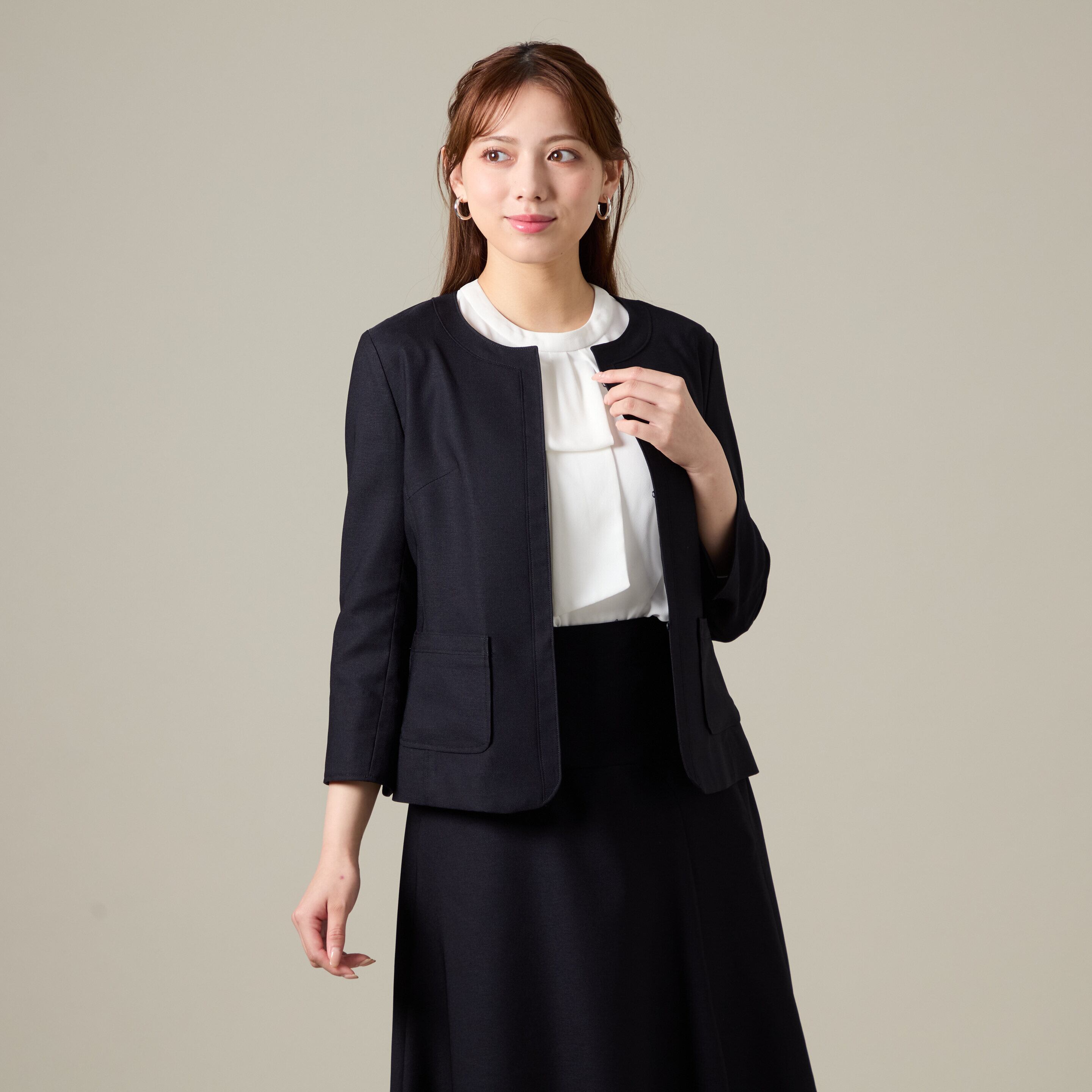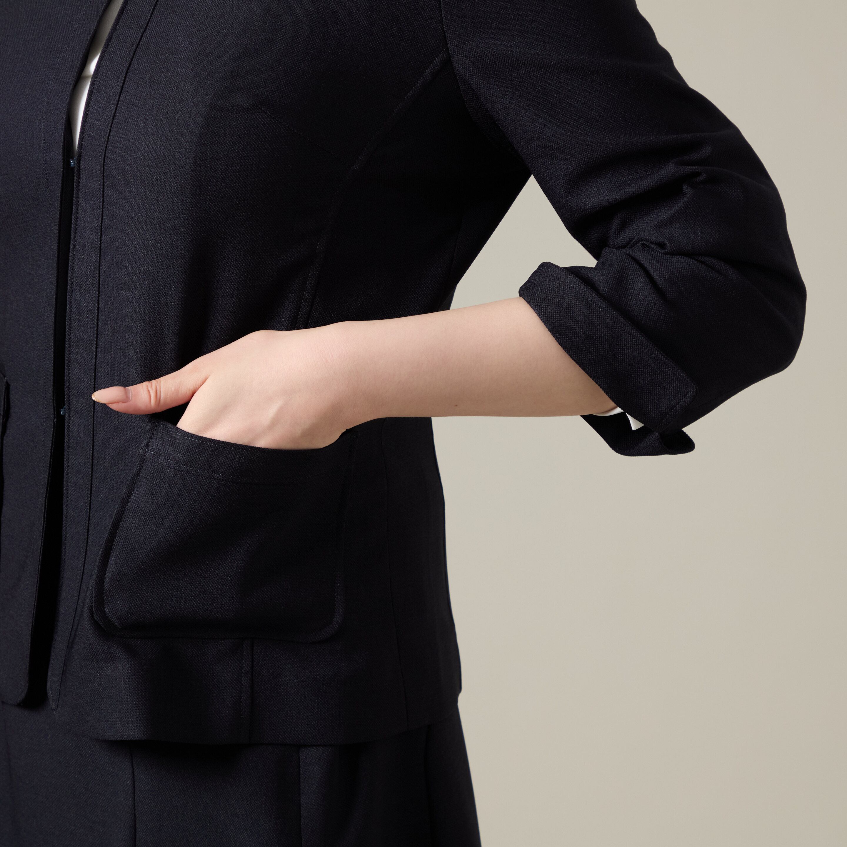 「スーツほど堅苦しくないけれど、信頼感はしっかり保ちたい」という声から生まれた、洗練されたノーカラージャケットです。