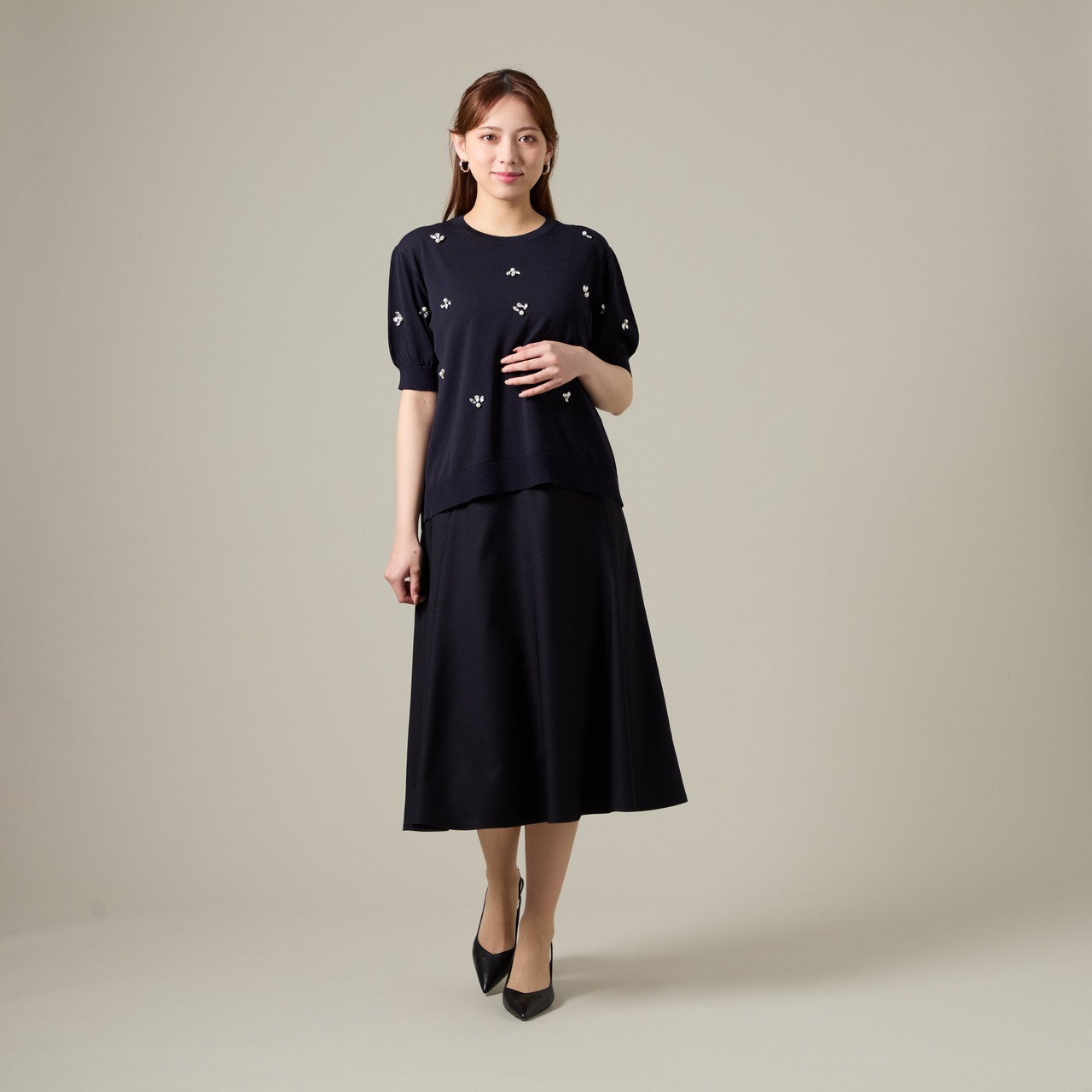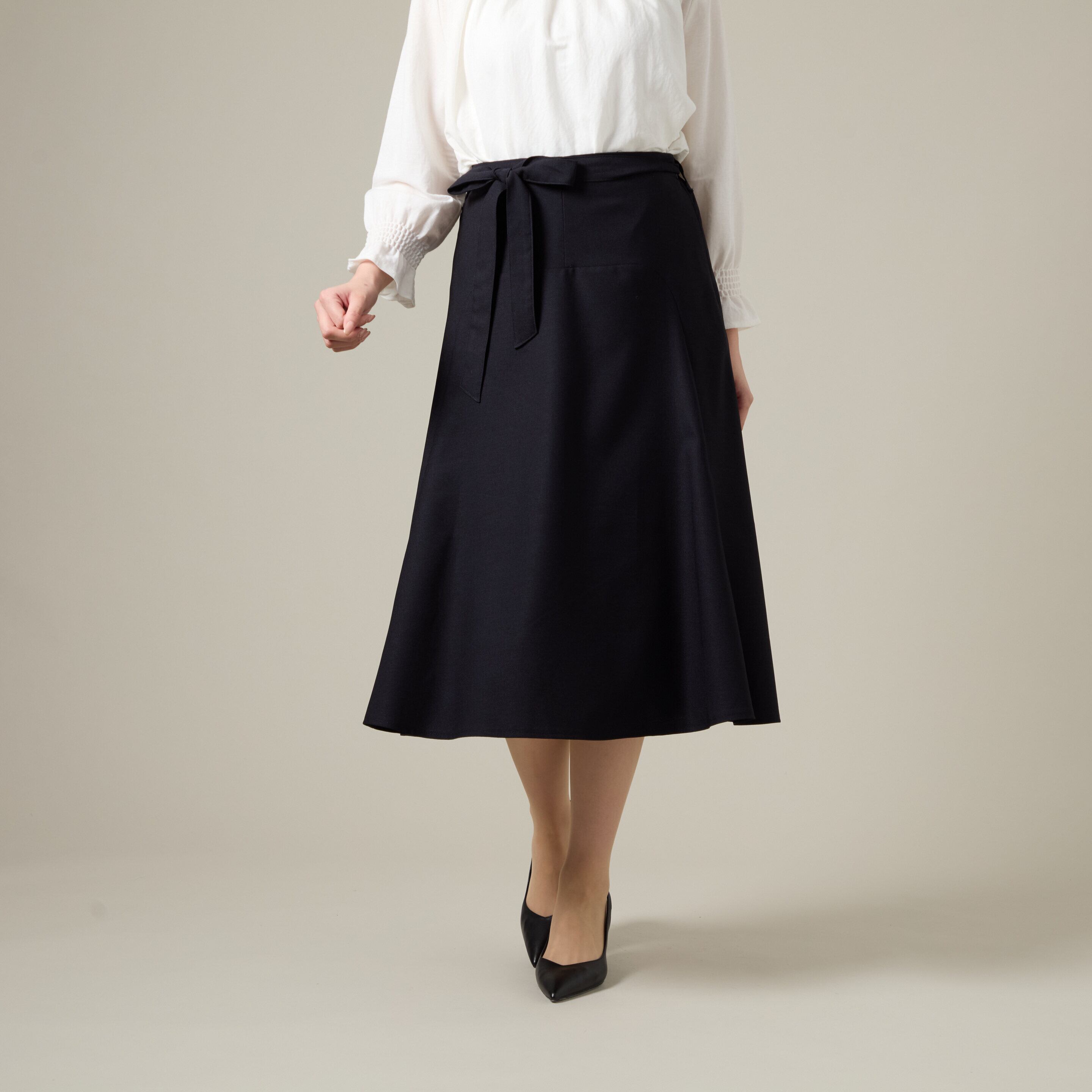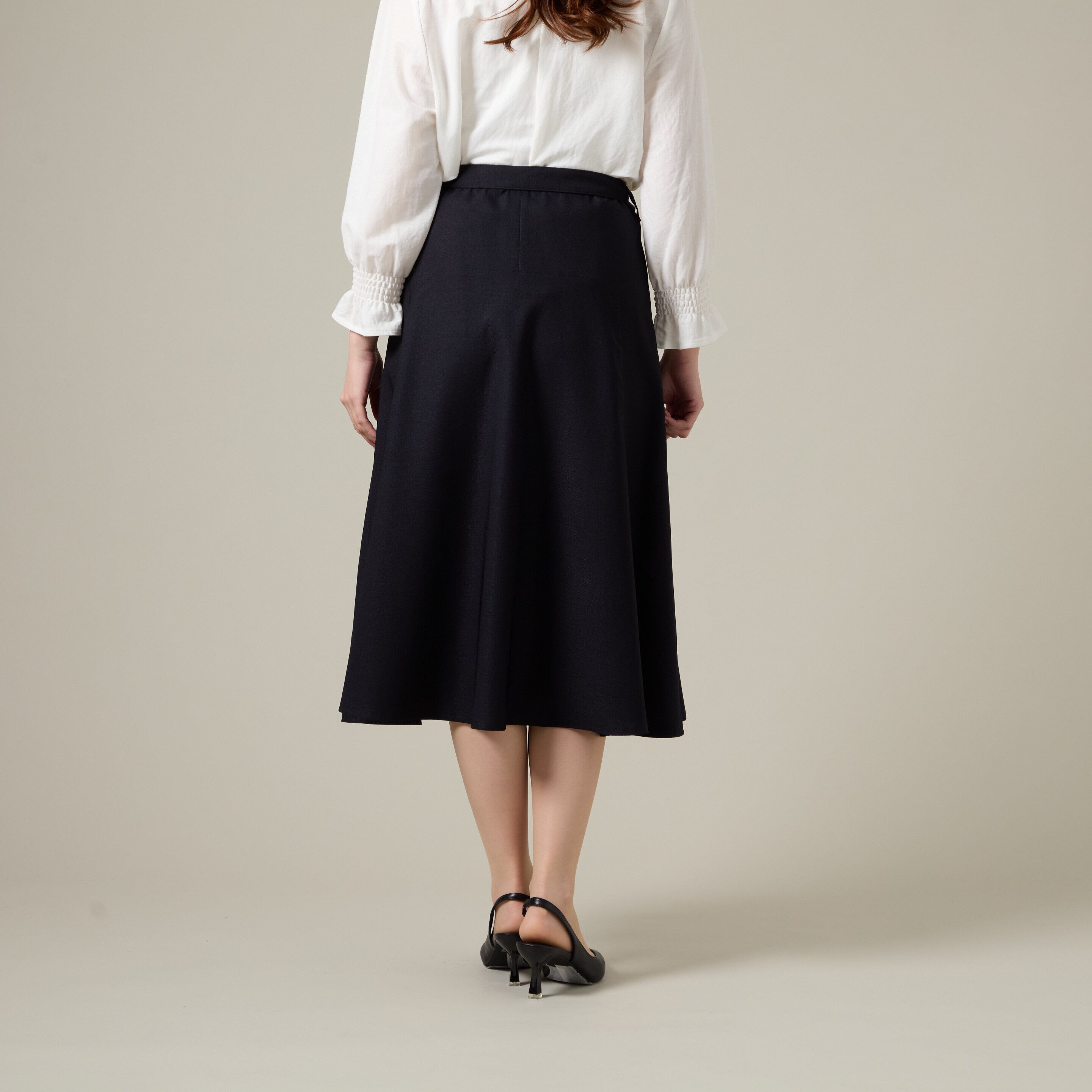 スカート: 広がりすぎない上品なフレアシルエット(あるいはセミタイト)。総丈が75cmと、膝をしっかり隠す落ち着いた丈感です。