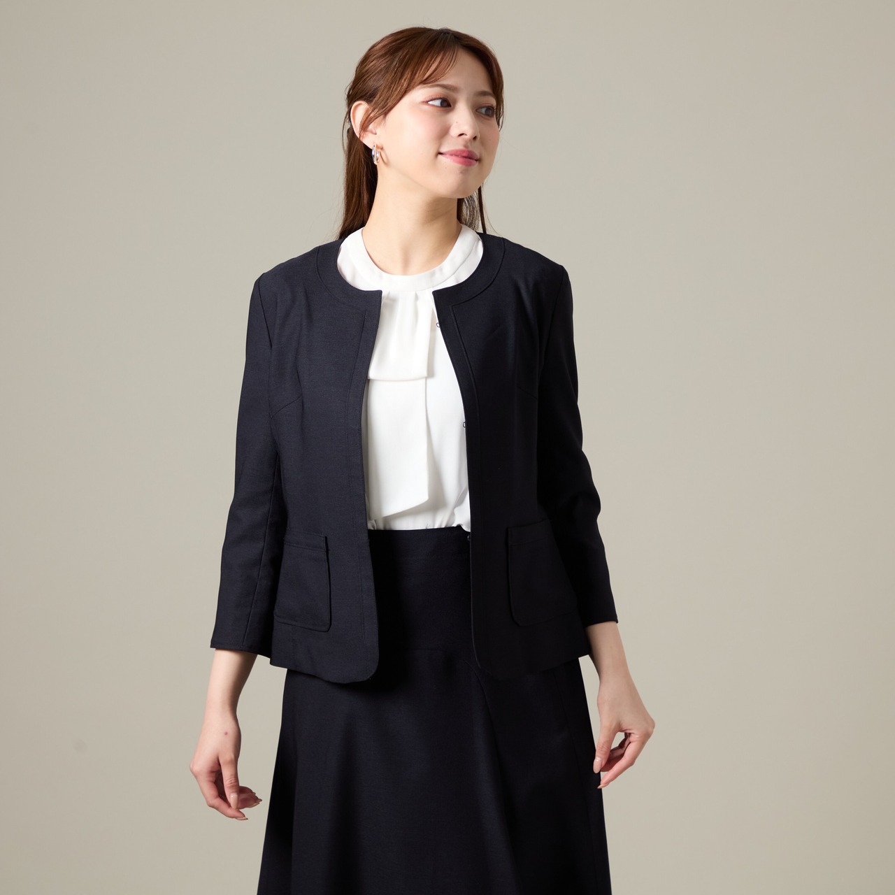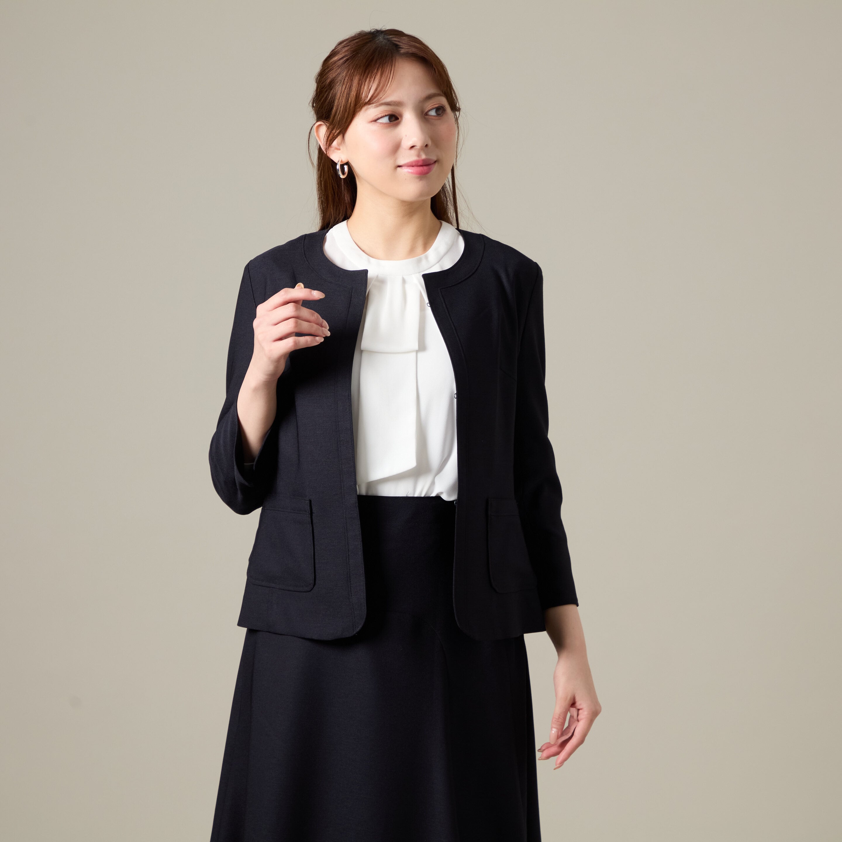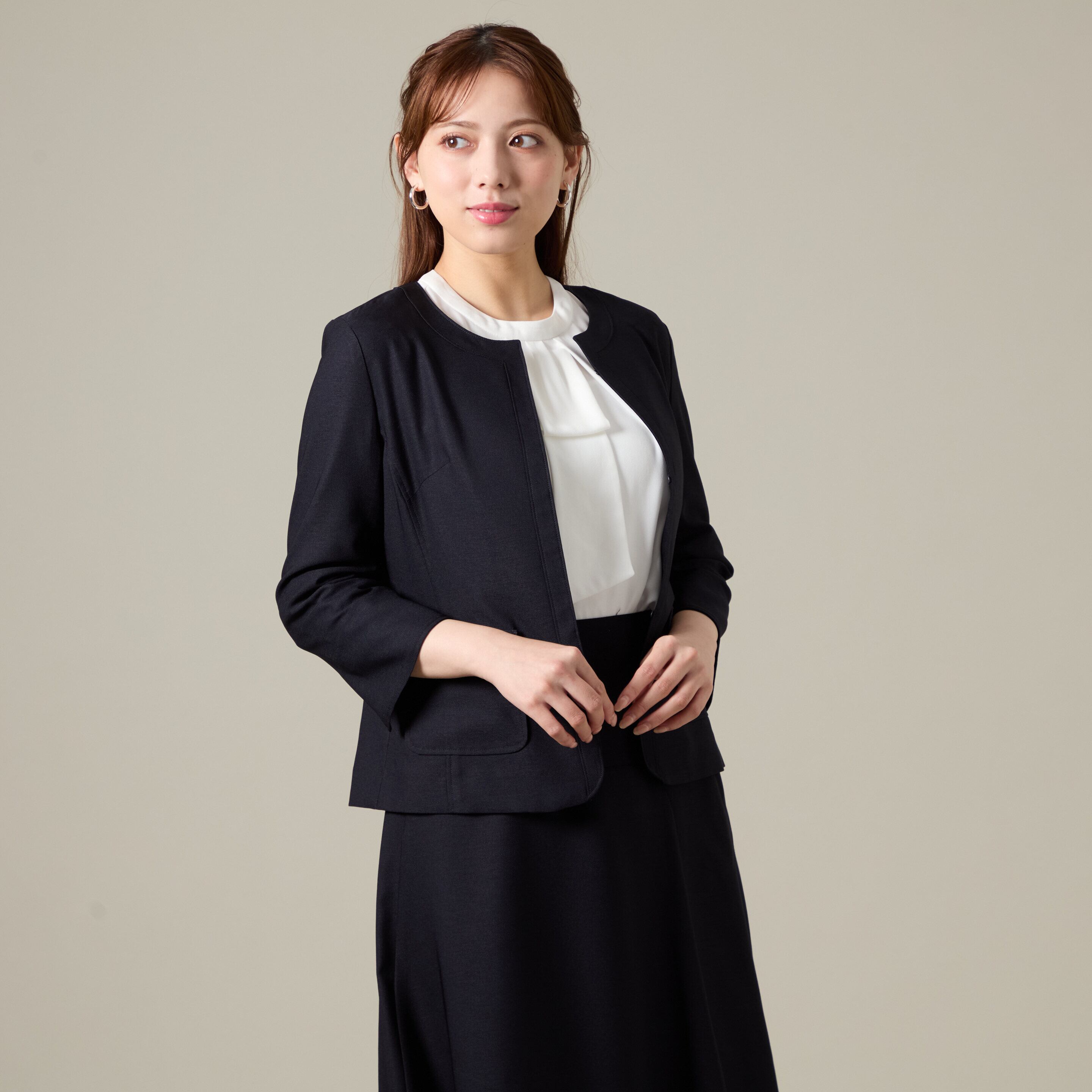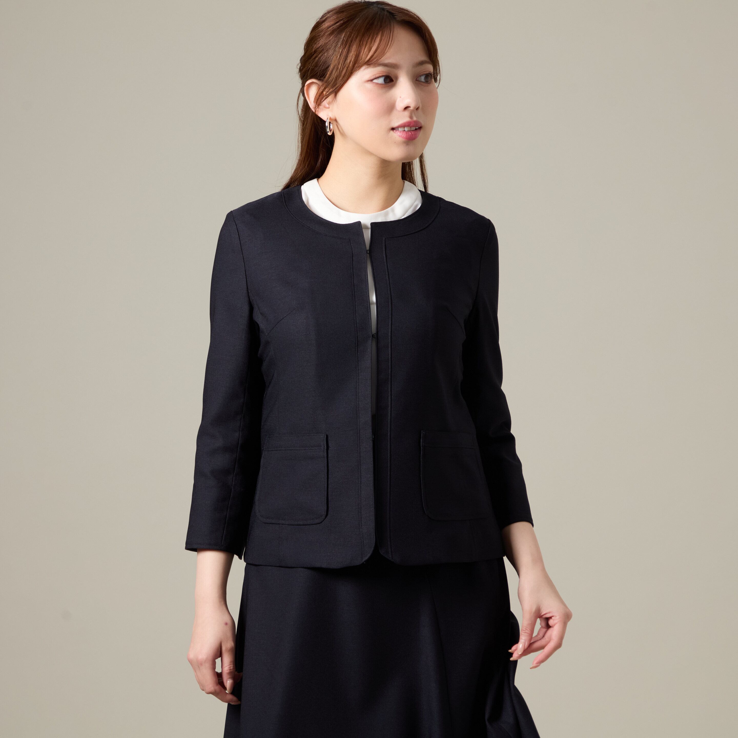 ジャケット: 首元をスッキリ見せるノーカラー。前立てにボタンが見えないミニマルなデザインで、洗練された都会的な印象を与えます。