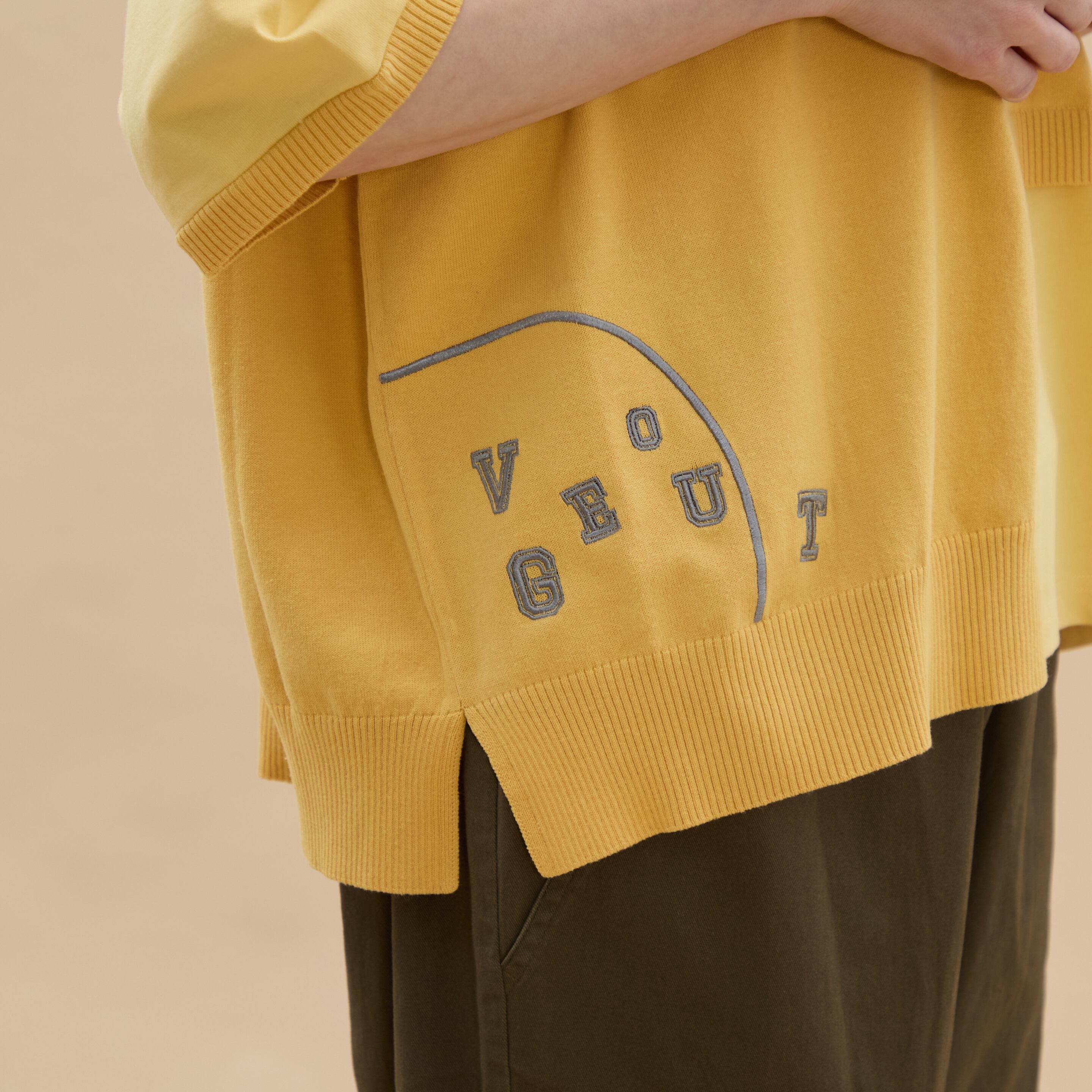 右裾に施されたワンポイント刺繍が、さりげないアクセントとなり、全体のスタイルに華やかさをプラスします。